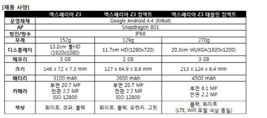 ¿¢½ºÆä¸®¾Æ Z3 ÄÄÆÑÆ® 4Á¾(ºí·¢, ÈÀÌÆ®, ¿À·»Áö, ±×¸°)°ú ¿¢½ºÆä¸®¾Æ Z3 ÅÂºí¸´ ÄÄÆÑÆ® 4Á¾(LTE ¸ðµ¨ ºí·¢, ÈÀÌÆ® ¹× WiFi ¸ðµ¨ ºí·¢, ÈÀÌÆ®)´Â 10¿ù Áß ¼±º¸ÀÏ ¿¹Á¤ÀÌ´Ù