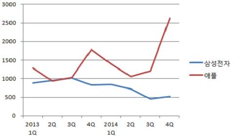 ¡ã »ï¼ºÀüÀÚ¿Í ¾ÖÇÃÀÇ ÃÖ±Ù ¸ÅÃâ ÃßÀÌ. Áö³ÇØ 4ºÐ±â »ï¼ºÀüÀÚ°¡ ¾ÖÇÿ¡ ¿ªÀüÀ» Çã¿ëÇß´Ù.¡´ÀÚ·á=°¢»ç Á¾ÇÕ¡µ