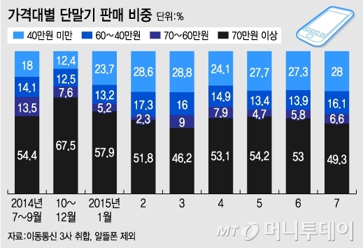 ½ÃÀå È帧ÀÇ º¯È­¿Í ´õºÒ¾î ÀÌ¿ëÀÚµéÀÌ ¼±ÅÃÇÒ ¼ö ÀÖ´Â ÁßÀú°¡ ½º¸¶Æ®Æù Á¦Ç°±ºÀÌ ´Ã¾î³ª¸é¼­ ¼ÒºñÀÚµéÀÇ ÈÞ´ëÆù ±¸ÀÔºñ ºÎ´ãµµ ³·¾ÆÁ³´Ù. À̵¿Åë½Å 3»çÀÇ ´Ü¸»±â ÆÇ¸Å ºñÁß¿¡ µû¸£¸é, 40¸¸¿ø ¹Ì¸¸ÀÇ º¸±ÞÇü ÈÞ´ëÆùÀ» ±¸¸ÅÇÏ´ø ÀÌ¿ëÀÚ´Â 18%¿¡ ºÒ°úÇßÀ¸³ª, Áö³­ 7¿ù¿¡´Â 28%·Î ±ÞÁõÇß´Ù. 70¸¸¿ø ÀÌ»ó °í°¡ÆùÀ» ¼±ÅÃÇÏ´Â ÀÌ¿ëÀÚµµ ´Ü¸»±â À¯Åë¹ý ½ÃÇà ÀÌÀü¿¡´Â 54.4%¿¡ ´ÞÇßÀ¸³ª, Áö³­ 7¿ù¿¡´Â 49.3%·Î ÁÙ¾îµé¾ú´Ù.