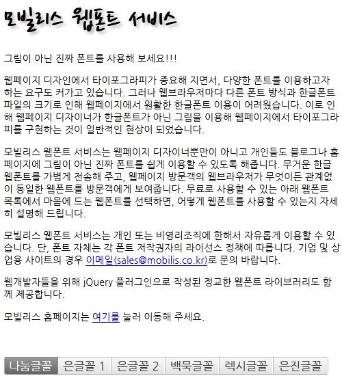 ¸ðºô¸®½º À¥ÆùÆ® ¼ºñ½º´Â ³ª´®±Û²Ã, Àº±Û²Ã1, Àº±Û²Ã2, ¹é¹¬±Û²Ã, ·º½Ã±Û²Ã, ÀºÁø±Û²Ã, 6°³ ¹À½À¸·Î ¼ö½Ê°¡Áö ÇÑ±Û ±Û²ÃÀ» Á¦°øÇÑ´Ù. ¼ºñ½º ¼Ò°³ ÆäÀÌÁö¿¡ ±Û²Ã ¸ñ·ÏÀÌ ³ª¿Â´Ù. ¹æ¹®ÀÚµéÀÌ °¢ ±Û²ÃÀ» ´©¸£¸é »ç¿ë¹ýÀ» º¼ ¼ö ÀÖ´Ù.