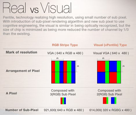 ÇÏÁö¸¸, ÈÁúÀ» ¼¼¹ÐÇÏ°Ô µûÁö°Ô µÇ¸é Â÷À̰¡ ¶Ñ·ÇÇÏ°Ô ³ªÅ¸³ª°Ô µÈ´Ù. ¿ì¼± ÆæÅ¸ÀÏ¿¡¼± ¼ºê Çȼ¿ÀÇ Å©±â°¡ RGBº¸´Ù Ä¿´Ù. ÇϳªÀÇ Çȼ¿ Å©±â¸¦ 1À̶ó°í Çϸé RGB¿¡¼´Â °¢°¢ÀÇ Å©±â°¡ 1/3ÀÌ µÇÁö¸¸, ÆæÅ¸ÀÏ¿¡¼± 2/3°ú 1/3À¸·Î ÀÌ·ç¾îÁø´Ù. ºñ·Ï ¼ºê Çȼ¿ÀÇ Å©±âÀ̱ä ÇÏÁö¸¸, ÀÌ·± Á¡Àº ÈÁú¿¡ ¿µÇâÀ» ÁÖ°Ô µÈ´Ù.