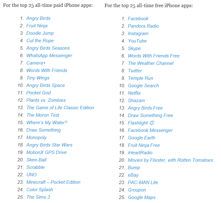 °¡Àå ¸¹ÀÌ ¹ÞÀº À¯·á ¾ÆÀÌÆù ¾ÛÀº ¾Þ±×¸®¹öµå(Angry Birds) ¿´´Ù. ÇÁ·í ´ÑÀÚ(Fruit Ninja), µÎµé Á¡ÇÁ(Doodle Jump), ÄÆ ´õ ·ÎÇÁ(Cut the Rope) ±×¸®°í ¾Þ±×¸®¹öµå ½ÃÁð½º(Angry Birds Seasons) µî À¯¸íÇÑ Ä³ÁÖ¾ó °ÔÀÓ ¾ÛÀÌ µÚ¸¦ À̾ú´Ù.