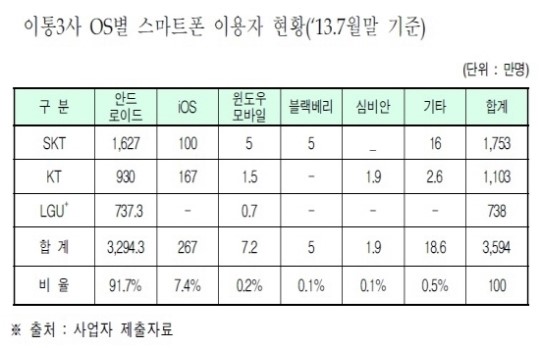 ÇöÀç ÀÌ¿ëµÇ°í ÀÖ´Â ½º¸¶Æ®Æù OS Áß¿¡¼´Â ¾Èµå·ÎÀÌµå ºñÁßÀÌ ´Ü¿¬ ³ô´Ù. ¾Èµå·ÎÀÌµå »ç¿ëÀÚ´Â ÃÑ 3294¸¸3000¸íÀ¸·Î ÀüüÀÇ 91.7%¿¡ ´ÞÇß´Ù. ¾ÆÀÌ¿À¿¡½º´Â 267¸¸¸íÀÌ ½á 7.3% Á¡À¯À²À» ±â·ÏÇß´Ù. ¾ÆÀÌ¿À¿¡½º ÀÌ¿ëÀÚ´Â SKÅÚ·¹ÄÞ 100¸¸¸í KT 167¸¸¸íÀÌ´Ù. ¾ÖÇÃÀÇ ¾ÆÀÌÆù µµÀÔÀ» ¸ÕÀúÇÑ KT°¡ ¾ÆÀÌÆù °¡ÀÔÀڸ鿡¼ ¿©ÀüÈ÷ ¿ìÀ§´Ù. ÇÏÁö¸¸ ÇÑ ¶§ ±¹³» ½º¸¶Æ®Æù ÆÇ¸Å·® Á¡À¯À² 10%¸¦ ¾ÖÇÃÀÌ °¡Á®°¬´ø °ÍÀ» °í·ÁÇÏ¸é ±â´ëÄ¡¿¡ ¸ø ¹ÌÄ£´Ù. ¾ÖÇÃÀÌ ½ÅÁ¦Ç° ¡®¾ÆÀÌÆù5S¡¯¿Í ¡®¾ÆÀÌÆù5C¡¯¸¦ ¿¹³âº¸´Ù ÀÏÂï ±¹³» ÅõÀÔÇÏ´Â °Íµµ ±×·¡¼·Î º¸ÀδÙ.