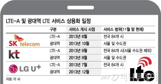 µÎ°³ÀÇ Á֯ļö ´ë¿ªÀ» ¹¾î °í¼Ó µ¥ÀÌÅÍ ¼ºñ½º¸¦ Á¦°øÇÏ´Â LTE-A´Â Áö³ 6¿ù SKÅÚ·¹ÄÞÀ» ½ÃÀÛÀ¸·Î ÇöÀç À̵¿Åë½Å 3»ç(KT ¼¿ï, ¼öµµ±Ç Á¦¿Ü)°¡ 84°³ Àü±¹ ½Ã ´ÜÀ§¿¡¼ »ó¿ë ¼ºñ½º¸¦ Á¦°ø ÁßÀÌ´Ù.