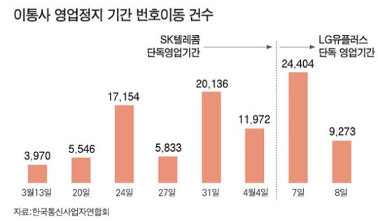 9ÀÏ À̵¿Åë½Å¾÷°è¿¡ µû¸£¸é Áö³­ 7~8ÀÏ À̵¿Åë½Å¾÷°èÀÇ ¹øÈ£À̵¿°Ç¼ö°¡ 3¸¸3,518°ÇÀ» ³Ñ¾î¼¹´Ù. Á¤ºÎ¿¡¼­´Â À̵¿Åë½Å 3»ç ÇÕÃļ­ ÇÏ·ç Æò±Õ 2¸¸4,000°ÇÀÇ ¹øÈ£À̵¿ÀÌ ÀϾ¸é ºÒ¹ý º¸Á¶±ÝÀ» »ç¿ëÇØ ½ÃÀåÀÌ °ú¿­µÈ °ÍÀ¸·Î º»´Ù. 7ÀÏ¿¡´Â ÁÖ¸»(5,6ÀÏ) °¡ÀÔÀÚ Æ÷ÇÔÇØ 2¸¸4,404°Ç, 8ÀÏ¿¡´Â 9,273°ÇÀÇ ¹øÈ£À̵¿ÀÌ ÀϾ´Ù.