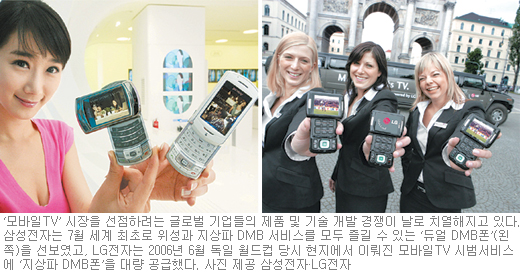 LGÀüÀÚµµ DVB-HÆù°ú ¹Ìµð¾îÇÃ·ÎÆù, ±×¸®°í 3¼¼´ë(G) À̵¿Åë½Å ¼­ºñ½ºÀÎ ¡®±¤´ë¿ªºÎÈ£ºÐÇÒ´ÙÁßÁ¢¼Ó(WCDMA)¡¯ ¹æ½ÄÀÇ DMBÆùÀ» ¸ðµÎ °³¹ßÇØ ¸ð¹ÙÀÏTV ½ÃÀå °ø·«¿¡ ³ª¼­°í ÀÖ´Ù.
