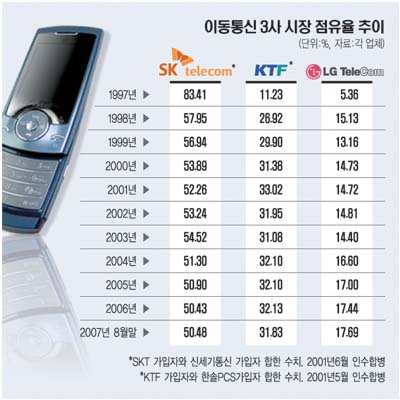 ÀÌÅë¾÷üµéÀº ÀÌÁ¦´Â Áö»óÆÄ DMB ½Ãû°ú ¸ð¹ÙÀÏ ¹ðÅ· ¼ºñ½º¿¡ À̸£±â±îÁö ÈÞ´ëÀüÈ Çϳª·Î ¼¼»ó°ú ÅëÇÏ´Â ½Ã´ë¸¦ ÇâÇØ ´Þ·Á°¡°í ÀÖ´Ù. ÀÌ °°Àº ±â¼ú·ÂÀÇ ¹ßÀü À̸鿡 PCS 3»çÀÇ ¡®°ø¡¯(Íí)ÀÌ ÀÖ¾úÀ½À» ºÎÀÎÇÏ±â ¾î·Æ´Ù. Áö³ 10³â°£ Àüü À̵¿Åë½Å °¡ÀÔÀÚ¼ö´Â 97³â ¸»¿¡ 682¸¸¸í¿¡¼ 98³â ¸»¿¡´Â 1398¸¸¸í, 99³â 2344¸¸¸í, 2002³â 3234¸¸¸íÀ¸·Î ²ÙÁØÈ÷ ´Ã¾î³µ´Ù. 2006³â¿¡´Â 4000¸¸¸íÀ» ³Ñ¾î¼¹°í, 2007³â 8¿ù ¸» ÇöÀç 4250¸¸¸í¿¡ À̸¥´Ù. pcs °¡ÀÔÀÚ¸¸ 8¿ù¸» ÇöÀç 2100¸¶¸íÀÌ´Ù. 97³â ¸» 15% ¼öÁØÀÌ´ø ±¹³» ÈÞ´ëÀüÈ º¸±Þ·üµµ ¿Ã 8¿ù ¸» ÇöÀç 86%·Î ¿Ã¶ó¼¹´Ù. ¾÷ü°£ ½ÃÀå Á¡À¯À²Àº SKÅÚ·¹ÄÞÀÌ 50.5%·Î ¼±µÎ¸¦ ´Þ¸®°í ÀÖ°í, KTF°¡ 31.8%, LGÅÚ·¹ÄÞÀÌ 17.7% ¼øÀÌ´Ù.