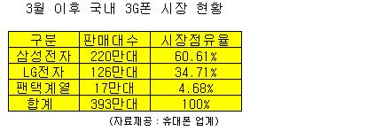 »ï¼ºÀüÀÚ´Â 3¿ù ÀÌÈÄ 9¿ù¸»±îÁö 220¿©¸¸´ëÀÇ 3G ÈÞ´ëÆùÀ» ÆÇ¸ÅÇß´Ù°í ¹àÇû´Ù. ÀϹÝÀûÀ¸·Î ±¹³» ÈÞ´ëÆù ½ÃÀåÀÇ 50~52% °¡·®À» Á¡À¯Çϰí ÀÖ´Â »ï¼ºÀüÀÚ°¡ 3G Æù ½ÃÀå¿¡¼´Â 60%ÀÇ Á¡À¯À²À» ±â·ÏÇϰí ÀÖ´Â °ÍÀÌ´Ù.