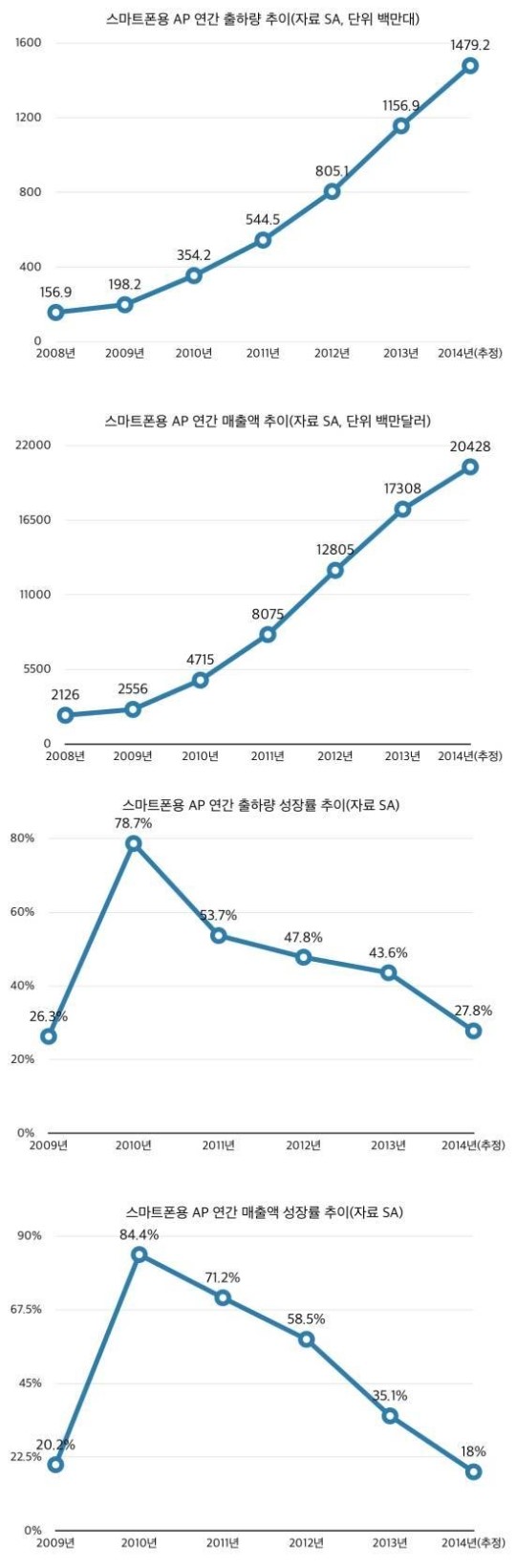 9ÀÏ ½ÃÀåÁ¶»ç¾÷ü ½ºÆ®·¡Æ¼Áö¾Ö³Î¸®Æ½½º(SA)°¡ ÃÖ±Ù ¹ßÇ¥ÇÑ ¿¹ºñÁ¶»ç ÀÚ·á¿¡ µû¸£¸é Áö³ÇØ ½º¸¶Æ®Æù¿ë AP ÃâÇÏ·®Àº 14¾ï7900¸¸´ë, ¸ÅÃâ¾×Àº 204¾ï2800¸¸´Þ·¯¸¦ ±â·ÏÇÑ °ÍÀ¸·Î ÃßÁ¤µÆ´Ù. Àü³â ´ëºñ °¢°¢ 27.8% 18% ¼ºÀåÇÑ ¼öÄ¡´Ù. ÀÌ °°Àº ¼ºÀåÀ²Àº °ú°Å ´ëºñ Å©°Ô ¸ø ¹ÌÄ¡´Â °ÍÀÌ´Ù. Áö³ÇØ ÃâÇÏ ¼ºÀå·üÀº 43.6%, ¸ÅÃâ ¼ºÀå·üÀº 35.1%¿´´Ù. ½º¸¶Æ®Æù¿ë AP ÃâÇÏ ¼ºÀå·üÀº 2010³â Á¤Á¡À» ÂïÀº ÀÌÈÄ ¸Å³â Á¶±Ý¾¿ µÐȵŠ¿ÔÁö¸¸ Áö³ÇØ ¼ºÀå·ü °¨¼ÒÆøÀº »ó´çÈ÷ ÄÇ´ø °ÍÀ¸·Î ³ªÅ¸³µ´Ù.