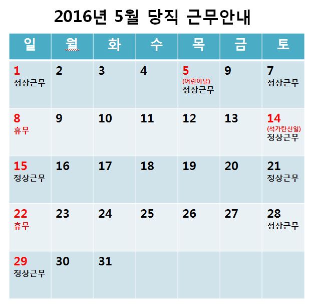 [2016³â 5¿ù ÁÖ¸» ¹× °øÈÞÀÏ ´çÁ÷±Ù¹« ¾È³»]
