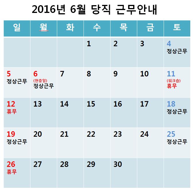[2016³â 6¿ù ÁÖ¸» ¹× °øÈÞÀÏ ´çÁ÷±Ù¹« ¾È³»]