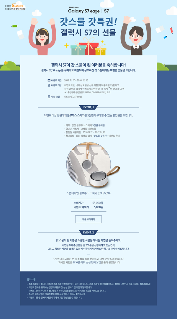 ¡Ú ±â°£ : 2016³â 11¿ù 17ÀÏ ~ 2016³â 12¿ù 16ÀÏ ¡Ú ´ë»ó´Ü¸» : °¶·°½ÃS7, S7 edge ¡Ú ´ë»ó°í°´ : ±â°£³» ´ë»ó´Ü¸»À» ±¸¸ÅÇϰí À̺¥Æ® Âü¿©ÇÑ ¸¸ 18~19¼¼ °í°´ (¹ýÁ¤»ý³â¿ùÀÏ : 1997.01.01 ~ 1999.02.28) ¡Ú À̺¥Æ® ³»¿ë 1) '½ºÄòµðÀÚÀÎ ºÒ·çÅõ½º ½ºÇÇÄ¿' 5õ¿ø¿¡ ±¸¸Å °¡´ÉÇÑ ÄíÆù ÁõÁ¤ (¼ÒºñÀÚ°¡ 55,000¿ø) Âü¿©¹æ¹ý : »ï¼º¸â¹ö½º¾îÇà > °«½º¹° °«Æ¯±Ç °¶·°½ÃS7ÀÇ ¼±¹° - ºí·çÅõ½º ½ºÇÇÄ¿ ±¸¸ÅÂù½º > Âü¿©Çϱâ 2) Ãß÷À» ÅëÇÑ °£½Ä Àü´Þ, ±ô¦ ·°Å°¹Ú½º À̺¥Æ® - À̺¥Æ® ³»¿ë : http://local.sec.samsung.com/comLocal/event/promotion/eventList.do?eventld=13438
