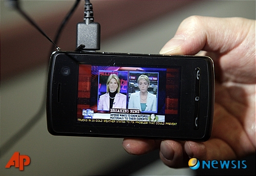 8ÀÏ(ÇöÁö½Ã°£) °³¸·µÈ ¹Ì±¹ ÃÖ´ëÀÇ ÀüÀÚÀü½Ãȸ £§2009 ¼ÒºñÀÚ°¡Àü Àü½Ãȸ(CES)£§ ¿¡¼ LG Àü½Ã°üÀÇ Á÷¿øÀÌ LG ÈÞ´ëÆùÀ¸·Î »ý¹æ¼Û TV¸¦ ½ÃûÇÏ´Â ½Ã¿¬À» ¹úÀ̰í ÀÖ´Ù.