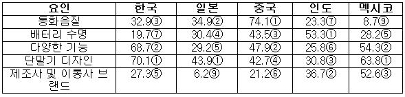 ÈÞ´ëÆùÀ» ¼±ÅÃÇÏ´Â µ¥ À־µµ ³ª¶ó º°·Î ´Ù¸¥ ¾ç»óÀ» º¸¿´´Ù. Çѱ¹Àº ±â´É°ú µðÀÚÀÎÀ» °ñ°í·ç Áß½ÃÇϰí, Áß±¹Àº ÅëÈ­À½ÁúÀ» °¡Àå Áß¿ä½Ã ¿©°å´Ù. Àεµ´Â ¹èÅ͸® ¼ö¸íÀ» °¡Àå Áß¿äÇÑ ¿äÀÎÀ¸·Î ²Å¾Ò°í, ¸ß½ÃÄÚ´Â µðÀÚÀÎÀ» °¡Àå Áß¿ä½ÃÇß´Ù. ÀϺ»Àº Á¦Á¶»ç ¹× ÀÌÅë»ç ºê·£µå¿¡ °ÅÀÇ Á¡¼ö¸¦ ÁÖÁö ¾Ê´Â Ư¡À» º¸¿´´Ù.