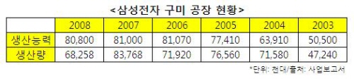 ¡ß°æ±â ħü, ¿ø°¡Àý°¨ »ýÁ¸ ¹®Á¦·Î ¡®ºÎ°¢¡¯=3ÀÏ Áö³­ 3¿ù31ÀÏ »ï¼ºÀüÀÚ°¡ °ø½ÃÇÑ 2008³â »ç¾÷º¸°í¼­¿¡ µû¸£¸é Áö³­ÇØ ±¸¹Ì ÈÞ´ëÆù °øÀåÀÇ »ý»ê·®Àº 6825¸¸8000´ë´Ù. Àü³â´ëºñ 1550¸¸5000´ë°¡ ÁÙ¾îµé¾ú´Ù. Áö³­ 2004³â ÀÌÈÄ °¡Àå ³·Àº ¼öÄ¡´Ù. »ï¼ºÀüÀÚ ±¸¹Ì ÈÞ´ëÆù °øÀåÀº Áö³­ 2007³â¿¡´Â 8376¸¸3000´ë, 2006³â¿¡´Â 7192¸¸´ë¸¦ ¸¸µé¾ú´Ù.