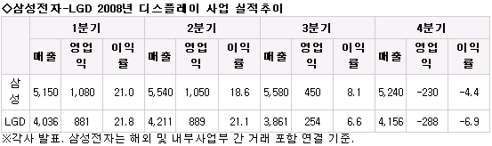 Áö³ÇØ 4ºÐ±â »ï¼ºÀüÀÚ(LCDºÎ¹®)¿Í LGD´Â °¢°¢ ¿¬°á±âÁØ 2õ300¾ï¿ø, 2õ880¾ï¿øÀÇ ¼Õ½ÇÀ» ±â·ÏÇϸç ÀûÀÚ ÀüȯÇß´Ù. º»»ç ±âÁØ ÀûÀÚ ±Ô¸ð´Â °¢°¢ 3õ500¾ï¿ø, 4õ330¾ï¿øÀ̾ú´Ù.