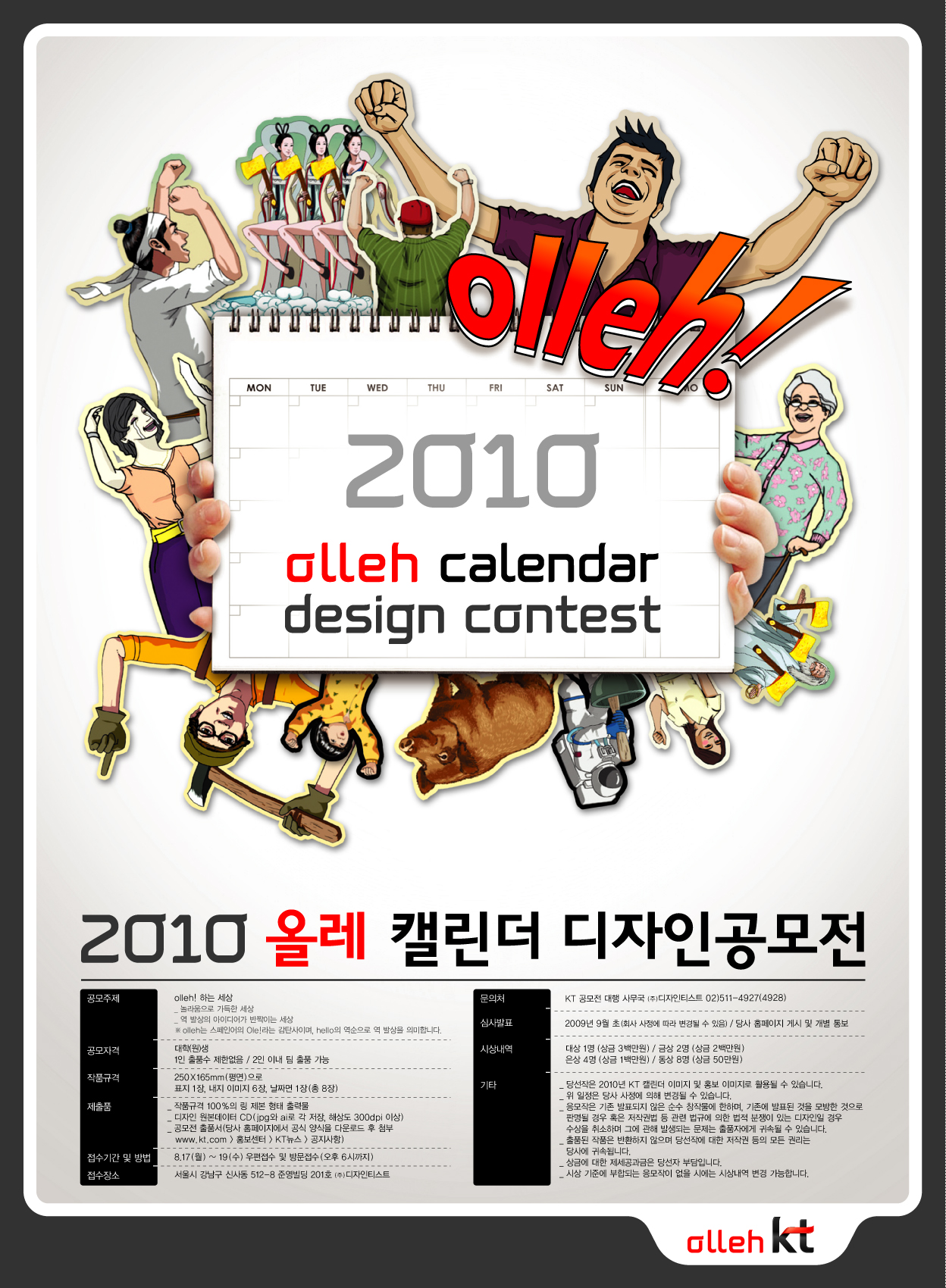 ÀÀ¸ðÀÚ°ÝÀº ´ëÇÐ(¿ø)»ýÀ» ´ë»óÀ¸·Î Çϸç 2ÀÎ À̳»ÀÇ ÆÀÀ¸·Î Áö¿øÀÌ °¡´ÉÇÏ´Ù. ÃâǰÀÛ ¼ö¿¡´Â Á¦ÇÑÀÌ ¾ø´Ù. Á¢¼ö±â°£Àº 8¿ù 17ÀϺÎÅÍ 19ÀϱîÁöÀÌ¸ç ´ë»ó 1¸í¿¡°Ô´Â ÃÑ 300¸¸¿øÀÇ »ó±ÝÀÌ ¼ö¿©µÇ¸ç, ´ç¼±ÀÛÀº 2010³â KT͏°´õ À̹ÌÁö¿¡ »ç¿ëµÉ ¼ö ÀÖ´Ù.