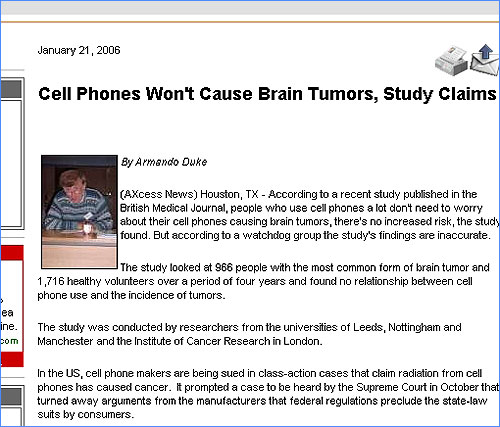 º¸µµ¿¡ µû¸£¸é ¸®Áî, ³ëÆÃÇð, ¸Çü½ºÅÍ ´ëÇÐ(Universities of Leeds, Nottingham, and Manchester)°ú ·±´øÀÇ ¾Ï ¸®¼­Ä¡ Àç´Ü(Institute of Cancer Research in London) °úÇÐÀÚµéÀº 2000³â 12¿ù 1ÀϺÎÅÍ 2004³â 2¿ù 29ÀϱîÁö ¾à 4³â µ¿¾È ¼ºÀÎ 1716¸íÀ» ´ë»óÀ¸·Î ½Å°æ±³Á¾(glioma, ³úÁ¾¾çÀÇ ÀÏÁ¾)ÀÇ À§Çè Á¤µµ¿¡ ´ëÇØ Á¶»çÇÑ °á°ú ³úÁ¾¾ç°ú ÈÞ´ëÀüÈ­´Â Å« °ü°è°¡ ¾ø´Â °ÍÀ¸·Î ³ªÅ¸³µ´Ù.