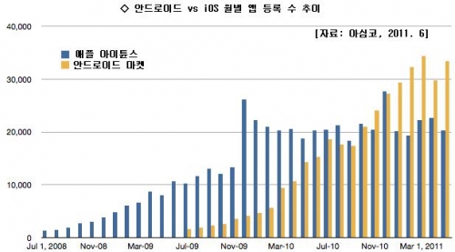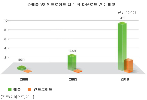 ¿À¹üÀº ¿À´Â 2015³â±îÁö ¾Èµå·ÎÀÌµå ¾Û ´Ù¿î·Îµå °Ç¼ö´Â ¿¬ Æò±Õ 80% ÀÌ»ó Áõ°¡ÇÒ °ÍÀ¸·Î Àü¸ÁÇß´Ù. ¹Ý¸é °°Àº ±â°£ ¾ÆÀÌÆù ¾ÛÀÇ ´Ù¿î·Îµå °Ç¼ö Áõ°¡À²Àº 30%¸¦ Á¶±Ý ¿ôµ¹ °ÍÀ¸·Î Àü¸ÁµÆ´Ù. Àû¾îµµ ¼ýÀûÀÎ ¸é¿¡¼± ¾Èµå·ÎÀÌµå ±º´ÜÀÌ ¾ÆÀÌÆù Áø¿µÀ» ¿ÏÀüÈ÷ ³Ñ¾î¼±´Ù´Â ¾ê±â´Ù.