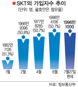 31ÀÏ ¾÷°è¿¡ µû¸£¸é Áö³­ 27ÀÏ ÇöÀç SKTÀÇ °¡ÀÔÀÚ´Â 1996¸¸1000¸íÀ¸·Î 6¿ù ¸»(1998¸¸4000¸í)º¸´Ù ¿ÀÈ÷·Á 2¸¸3000¸í °¨¼ÒÇß´Ù. ¹Ý¸é ÀÌ ±â°£ KTF(ÃßÁ¤)¿Í LGÅÚ·¹ÄÞÀº °¢°¢ 6¸¸9000¸í, 4¸¸3000¸í Áõ°¡Çß´Ù.