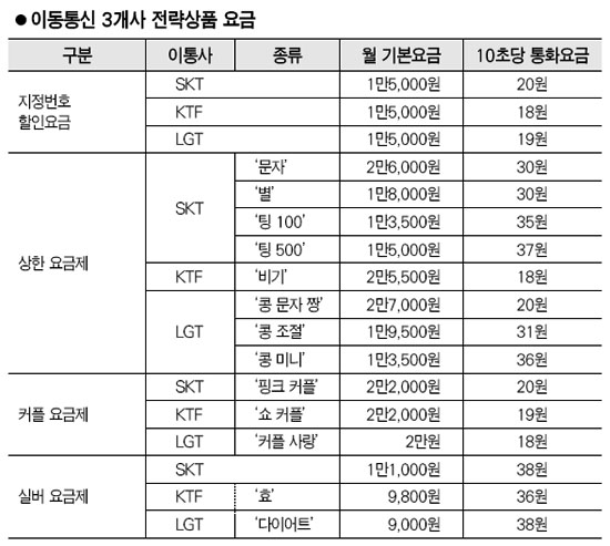 °¡Á· ȤÀº Ä£±¸, ÀÚÁÖ ÅëÈÇÏ´Â »ç¶÷ÀÌ Á¤ÇØÁ® ÀÖ´Ù¸é ¡®ÁöÁ¤¹øÈ£ ÇÒÀÎ ¿ä±ÝÁ¦¡¯¸¦ ¼±ÅÃÇÏ´Â °Ô À¯¸®ÇÏ´Ù. ÀÌ ¿ä±ÝÁ¦´Â ÀÌ¿ëÀÚ°¡ ÁöÁ¤ÇÑ 6°³ÀÇ ¹øÈ£¿¡ ´ëÇØ À½¼ºÅëÈ ¿ä±ÝÀ» 40%±îÁö ÇÒÀÎ ¹ÞÀ» ¼ö ÀÖ´Ù. À̵¿Åë½Å 3°³»ç°¡ ¸ðµÎ ½ÃÇàÇϰí ÀÖ´Â ÀÌ ¿ä±ÝÁ¦ÀÇ ±âº»¿ä±ÝÀº ¸ðµÎ ¿ù 1¸¸5,000¿øÀ¸·Î µ¿ÀÏÇÏ´Ù. 10ÃÊ´ç ÅëÈ¿ä±ÝÀº SKÅÚ·¹ÄÞ 20¿ø, KTF 18¿ø, LGÅÚ·¹ÄÞ 19¿øÀÌ´Ù.