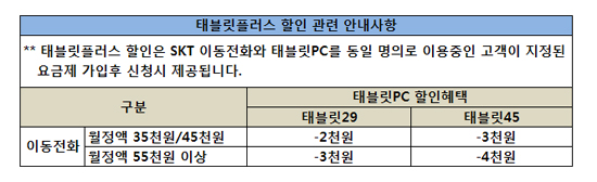 [Ãß°¡ ¿ä±ÝÁ¦ ÇýÅà ¾È³»] - ¹Ì»ç¿ë °í°´Àº Ãß°¡ÇÒÀÎ ¾øÀ½ 1.ÅÂºí¸´29_Ç÷¯½º35/45 : ±âÁ¸ SKT À̵¿ÀüÈ ¿ùÁ¤¾× 35/45 ¿ä±ÝÁ¦ »ç¿ë°í°´ÀÌ ±¸¸Å½Ã ¿ù2õ¿ø Ãß°¡ÇÒÀÎ. 2.ÅÂºí¸´45_Ç÷¯½º35/45 : ±âÁ¸ SKT À̵¿ÀüÈ ¿ùÁ¤¾× 35/45 ¿ä±ÝÁ¦ »ç¿ë°í°´ÀÌ ±¸¸Å½Ã ¿ù3õ¿ø Ãß°¡ÇÒÀÎ. 3.ÅÂºí¸´29_Ç÷¯½º55 : ±âÁ¸ SKT À̵¿ÀüÈ ¿ùÁ¤¾× 35/45 ¿ä±ÝÁ¦ »ç¿ë°í°´ÀÌ ±¸¸Å½Ã ¿ù3õ¿ø Ãß°¡ÇÒÀÎ. 4.ÅÂºí¸´45_Ç÷¯½º55 : ±âÁ¸ SKT À̵¿ÀüÈ ¿ùÁ¤¾× 35/45 ¿ä±ÝÁ¦ »ç¿ë°í°´ÀÌ ±¸¸Å½Ã ¿ù4õ¿ø Ãß°¡ÇÒÀÎ.