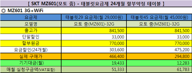 Á¦¸ñ ¡æ SKT ¸ðÅäÁÜ(MZ601) ÅÂºí¸´ 24°³¿ù ÇҺΠ¾àÁ¤ Å×ÀÌºí ¾È³»